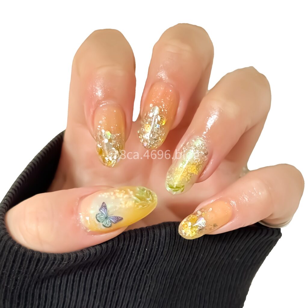 人間、挑戦したことより挑戦しなかったことに後悔するとはよく言う。まずはやってみたらいい。シアー系ホワイトをベースに、先端に高彩度のクリアイエローを塗布。爪の先をキラキラさせたくて載せたらなんとなく根元が寂しくて、そこに僅かにシアーベージュを足したところ・・・