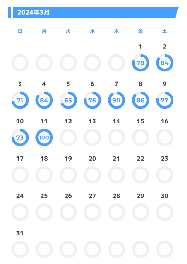 デュロキセチンが処方された通院日が2月22日(木)で、実際に服用し始めたのが2月23日(金)から。それまで比較的安定していた(寝る時間になったら起動してベッドに放り投げていただけというのもあるけれど)スコアが途端にガタガタになってしまったので大変にビビリ散らかした。しばらく続けたもののしっくり眠れた気がしなくて、先生には悪いと思いつつ朝飲むようにした。不思議と飲んだことによる眠気はこなくて、割ときびきび頭も回る気がする。ひっさびさに100点が取れてニコニコしたのが今朝の話。